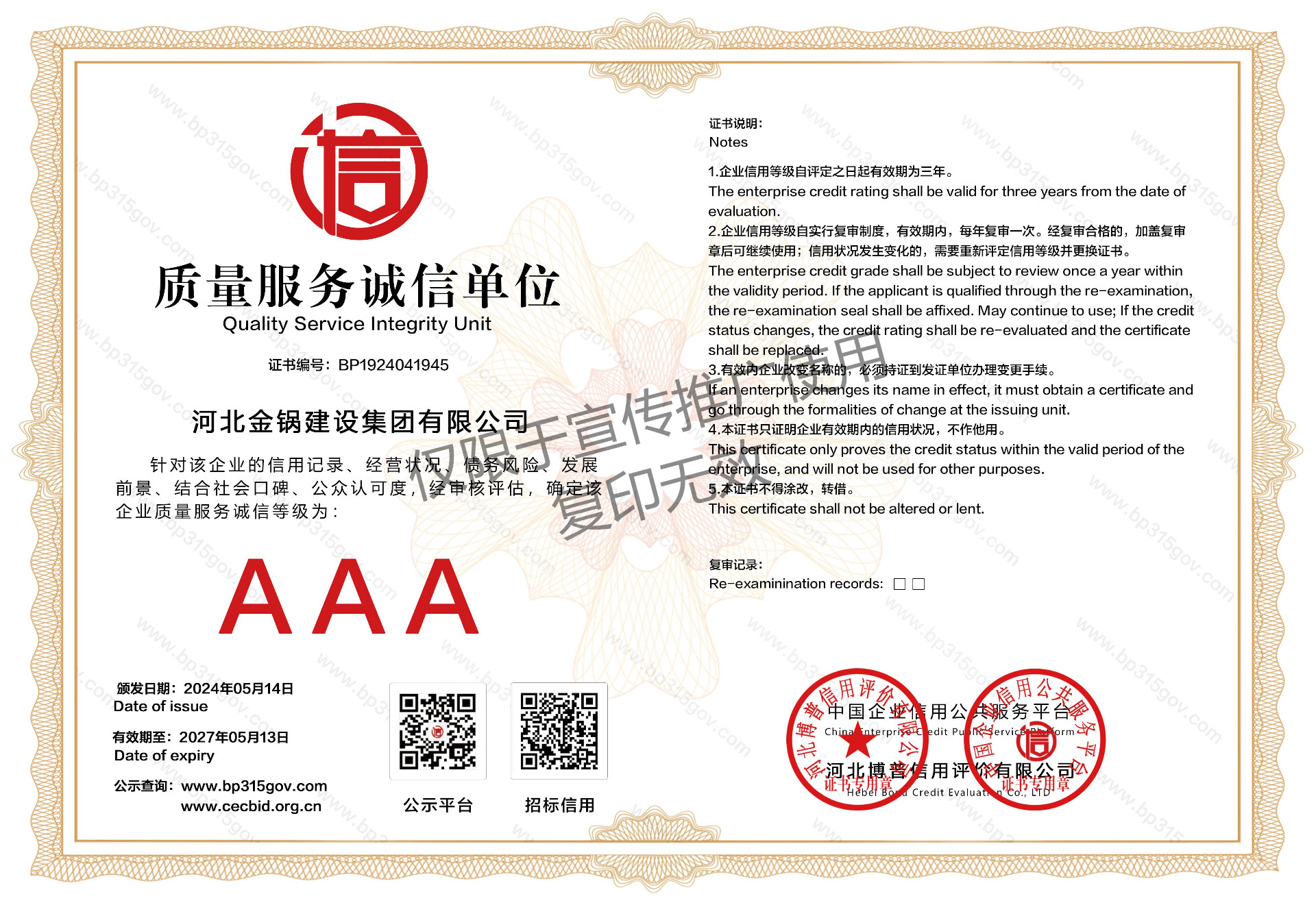 质量服务AAA级诚信单位证书